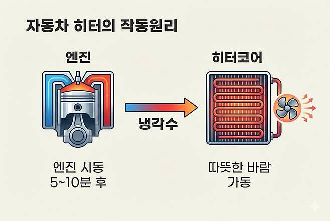 자동차 히터는 단순히 ‘뜨거운 바람을 내보내는 장치’가 아니다. 엔진 열을 활용해 실내 공기를 따뜻하게 만드는 구조이기 때문에, 내부 순환 시스템에 이상이 생기면 제 기능을 못하게 된다. 실제로 찬바람만 나오는 주요 원인으로는 ▲냉각수 부족 ▲써모스탯 고장 ▲온도조절 도어 불량 등이 꼽힌다.