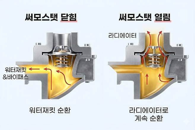 써모스탯은 엔진 내부의 냉각수 순환을 조절하는 부품으로, 정상 작동 시 냉각수가 히터 코어 쪽으로 잘 순환된다. 하지만 고장으로 인해 써모스탯이 계속 열려 있다면 냉각수가 라디에이터만 돌며 열을 충분히 받지 못하게 되고, 결국 히터에서 찬바람이 나오게 된다.
