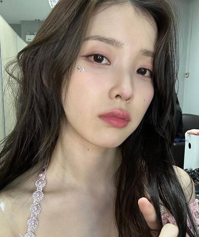 공개된 사진 속 아이유는 무대의상을 입고 '주얼 페이스' 메이크업을 하고 있다. 백옥 같은 피부와 얼굴에서부터 의상으로 이어지는 화려한 보석이 눈길을 사로 잡는다.