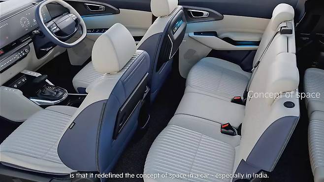 실내는 대시보드를 일부 재설계했으나 6·7인승 배치와 듀얼 10.25인치 디스플레이로 구성된 디지털 콕핏은 셀토스와 공유한다. 여기에 시로스(Syros)에서 가져온 리디자인 스티어링 휠과 고급 재질의 트림을 일부 도입했다.