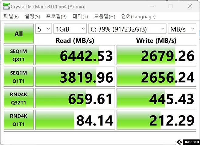 기본 탑재되어 있는 256GB NVMe SSD의 경우, 본격적인 PCIe 4.0을 지원하는 SSD가 탑재되어 있어 순차읽기는 6000MB/s에 달하는 모습을 보여주는 결과도 확인할 수 있었다.
