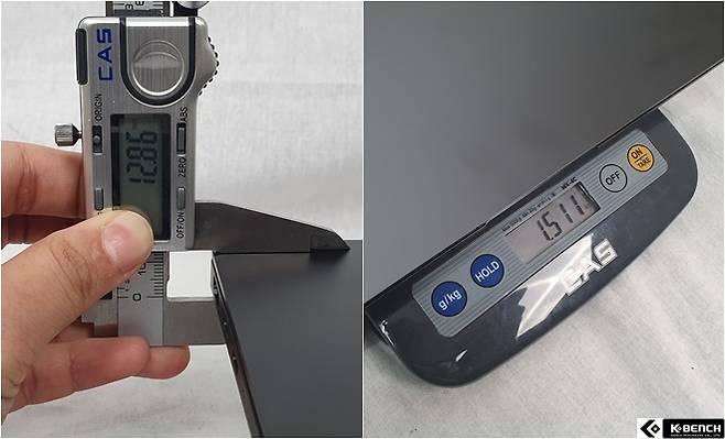 무게 또한 스펙 표기는 1.56kg이지만 1.51kg의 모습을 보여주어, 넓직한 면적 대비 상당히 얇고 가벼운 무게이기 때문에 휴대하고 다니는데에 무게나 두께로 인한 문제는 없을 것이라 생각된다. 다만 16인치의 면적 사이즈 때문에 백팩이나 전용 노트북 가방으로 들고 다니는 것이 안전하고 편리할 것이라고 보여진다.