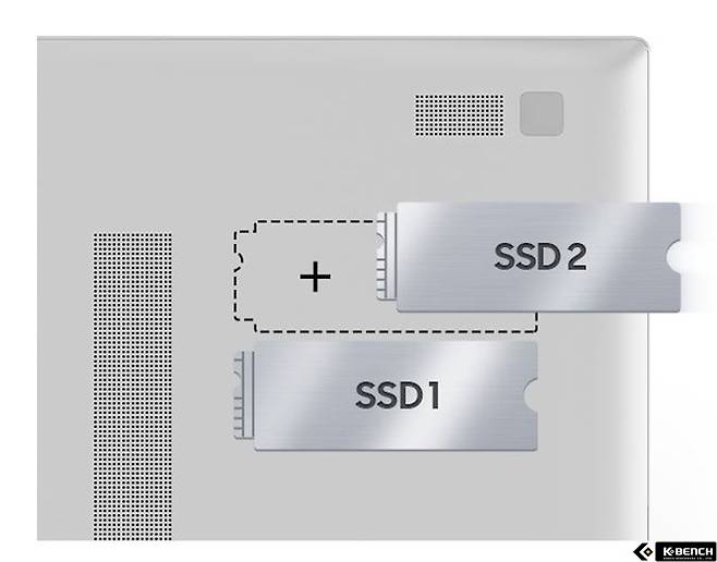 삼성전자 갤럭시북3 프로 NT960XFT-A51A 모델은 2개의 SSD 슬롯을 제공하고, 기본적으로 256GB SSD가 탑재되어 있는 상태다. 따라서, 저장공간이 부족하다고 느껴질경우, 별도의 추가 SSD 장착이 가능하다.