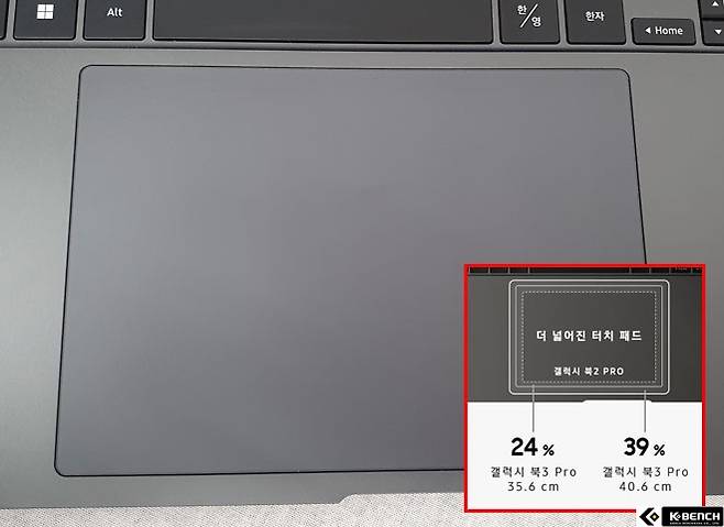 일단 가장 눈에 띄는 것은 트랙패드다. 삼성전자 갤럭시북3 프로 NT960XFT-A51A 모델에 제공되는 트랙패드가 확실히 더 넓어졌고, 16인치 기준으로 지난 세대와 비교해 39% 더 커진 면적을 자랑한다.