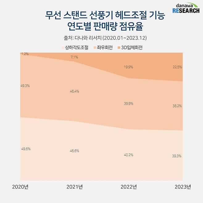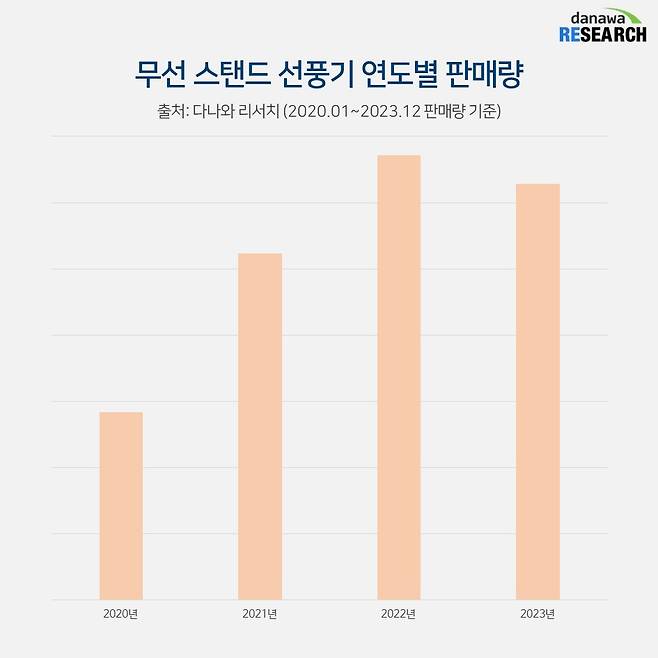다나와 리서치 데이터에 따르면 전체 선풍기 품목에서 무선 스탠드 제품의 파이가 점점 커지고 있다. 2020년과 2023년 판매량을 비교하면 2023년에는 120% 넘게 판매가 증가했다. 전체 선풍기에서 무선 스탠드가 차지하는 비중도 2020년 7.1%에서 2023년 17.9%로 두 배 이상 늘었다.