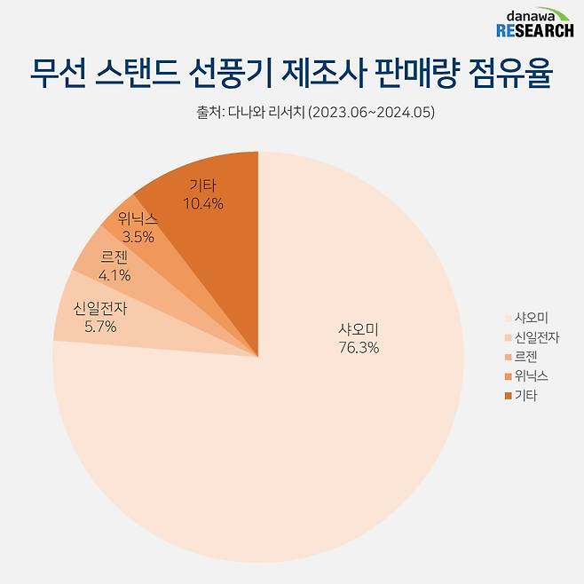 무선 스탠드 선풍기 품목은 그야말로 샤오미가 평정했다. 최근 1년간의 다나와 리서치 데이터를 보면 샤오미가 76.3%로 압도적인 1위에 올랐다. 최근 1년뿐만 아니라 2020년부터 2023년까지 매년 샤오미가 1위 자리에 군림했다.
