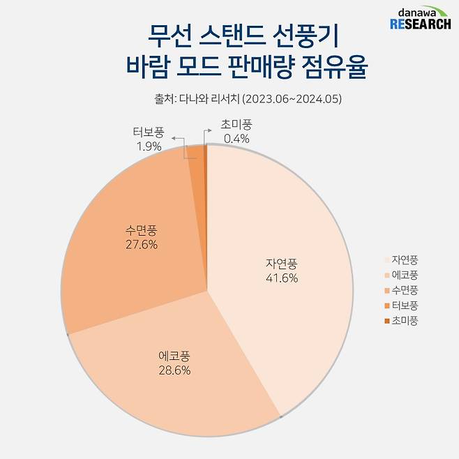 무선 스탠드 선풍기에 들어가는 바람 모드 판매량 점유율을 보면 자연풍, 에코풍, 수면풍이 인기를 얻고 있다. 41.6%로 가장 높은 점유율을 점유한 자연풍은 자동으로 센 바람과 약한 바람이 반복되는 모드를 말한다. 인위적인 바람보다 자연스러운 바람을 선호하는 사용자에게 적합하다.