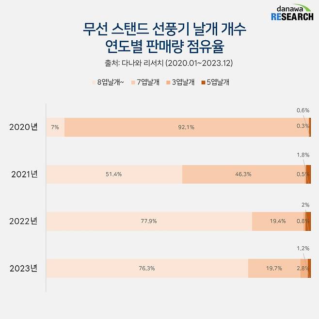 연도별 무선 스탠드 날개 개수 판매량 점유율을 보면 2020년까지 7엽 날개가 92.1%로 압도적이었지만 2021년부터 8엽 이상 날개가 1위를 기록하고 있다. 날개 개수가 많은 제품이 인기가 많은 현상에는 최근 소비자들이 저소음을 선호하기 때문으로 보인다.