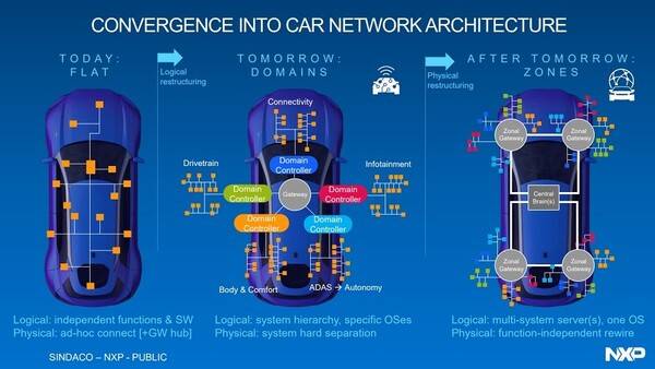 과거에는 각 부품별 ECU가 기능을 통제하는 분산형 아키텍처였으나, 현재는 차량 시스템이 첨단운전자지원(ADAS), 차체 및 섀시, 에너지 및 파워트레인, 인포테인먼트와 같은 기능 영역별로 그룹화되고, 각 영역 ECU가 기능을 통제하는 도메인(domain)형 아키텍처가 주를 이루고 있다.