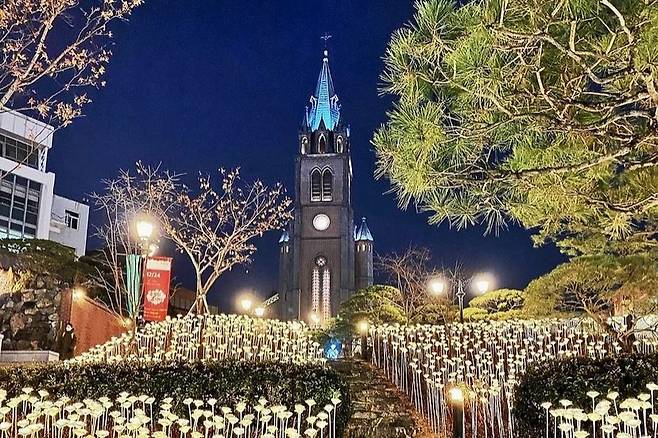 밤이 되면 성당을 감싸는 따뜻한 노란빛이 은은하게 퍼져 더욱 아름답고 경건한 느낌을 줍니다.