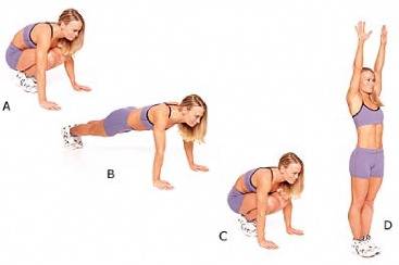 서서 시작해 스쿼트 자세로 내려간 후, 손을 바닥에 짚고 발을 뒤로 차내어 푸시업 자세를 만듭니다. 다시 발을 당겨 일어서며 점프합니다.