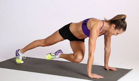 푸시업 자세에서 양 무릎을 번갈아 가슴 쪽으로 빠르게 당깁니다. 상체는 고정하고, 무릎이 바닥에 닿지 않도록 합니다. 속도감 있게 움직이면 유산소 효과까지 더해집니다.