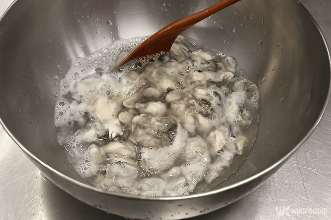 3. 생굴은 찬물에 천일염 1숟갈, 식초 약간을 넣고 숟가락으로 부드럽게 헹군다.