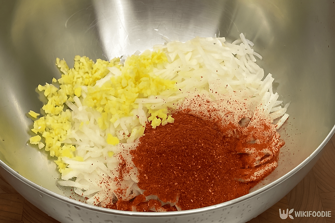6. 절인 무채의 물기를 꼭 짜고 양념과 함께 버무린다.