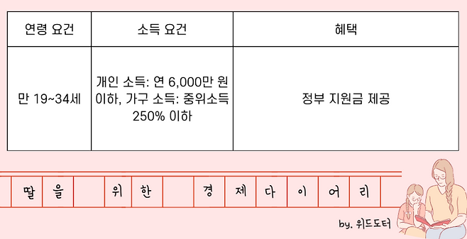 청년도약계좌 지원: 청년층이 자산을 형성하고 경제적 안정을 찾을 수 있도록 정부가 지원하는 저축형 금융 상품입니다. 연 소득 6,000만 원 이하, 가구 소득 기준 중위소득 250% 이하인 청년이 대상입니다.