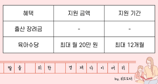 출산 장려금 및 육아수당: 출산과 육아의 경제적 부담을 줄이고, 아이 양육을 돕기 위한 금전적 지원과 복지서비스를 제공해요.