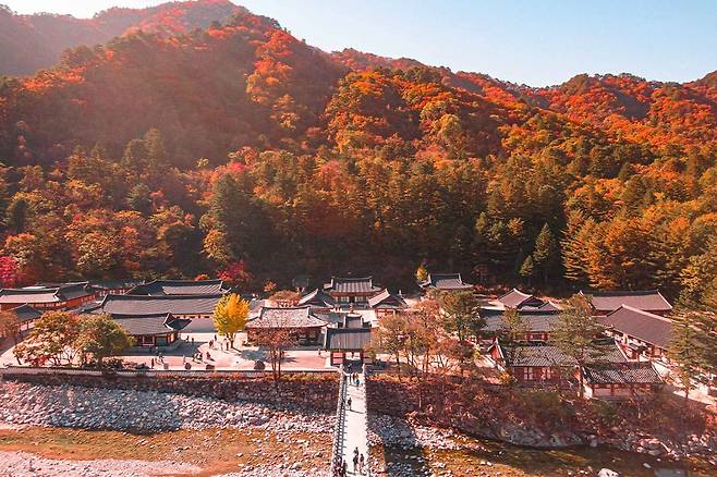 백담사는 설악산 자락에 위치한 고즈넉한 사찰로, 단풍철이면 붉은 단풍과 함께 평온한 분위기를 자아냅니다.