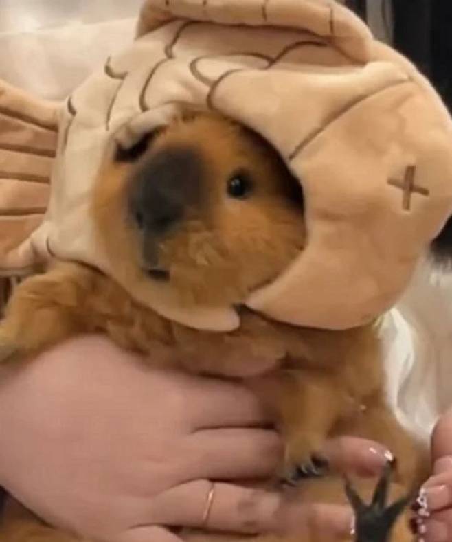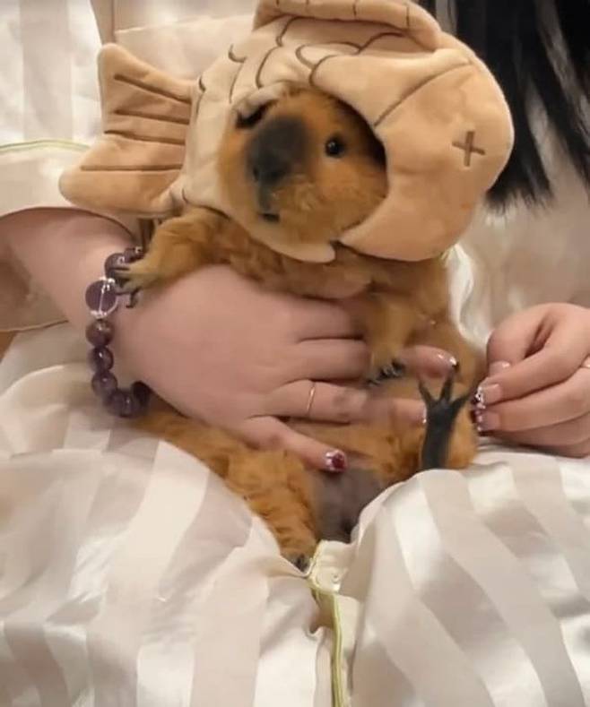 놀랍게도 이 동물은 기니피그라고 하는데요. 기니피그는 소동물 중의 하나입니다. 붕어빵 탈인형을 선물 받아 얼굴에 쓴 녀석의 모습 정말 너무 귀여운 것 아닌가요.