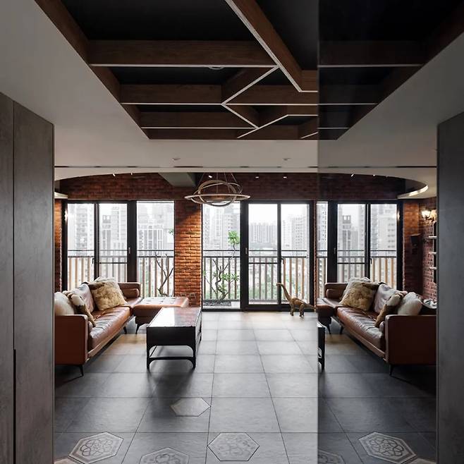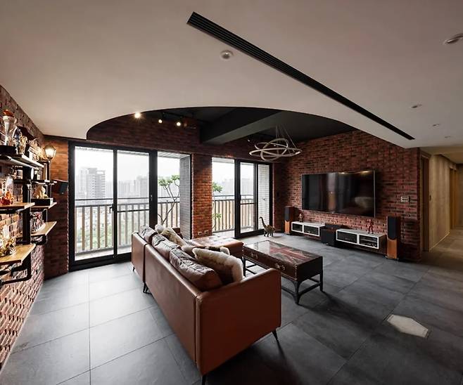 회색 바닥 타일과 오래된 벽돌이 만나 뉴욕 로프트를 연상시키는 분위기를 자아냅니다. 높은 층고 덕분에 창밖의 탁 트인 전망이 공간의 가장 큰 매력이 되었고, 천장에서 내려오는 구형 조명은 작은 행성처럼 공간에 독특한 포인트를 줍니다.