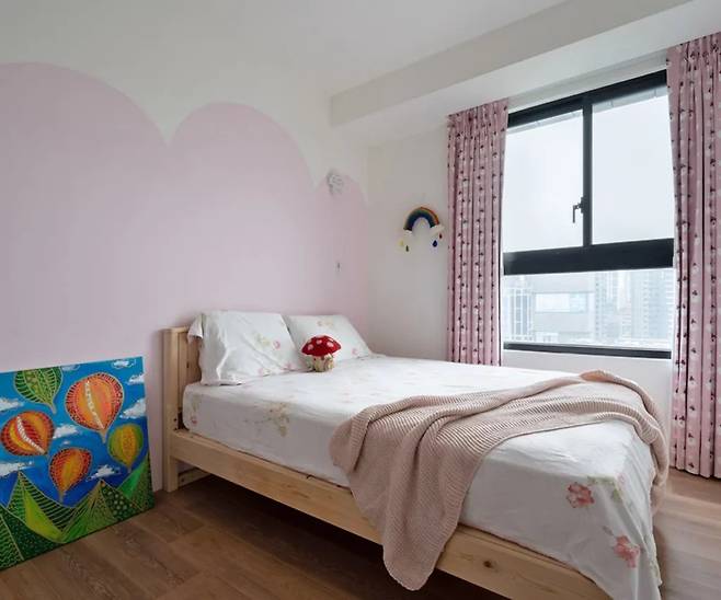 파스텔 핑크 톤으로 아이의 순수함을 표현한 공간입니다. 시스템 가구와 위로 쌓아 올린 수납장을 통해 다양한 의류와 장난감을 효율적으로 정리할 수 있습니다.