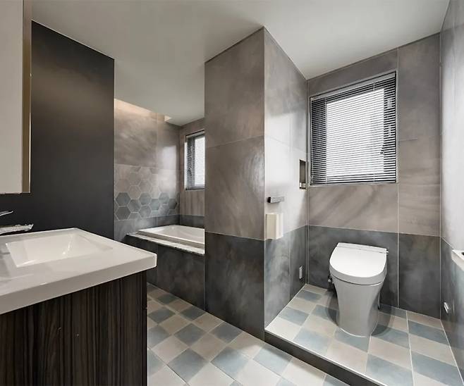 안방 욕실은 넓은 공간감을 최우선으로 고려했습니다. 건식과 습식을 분리하면서도 4점식 설비를 모두 갖춘 럭셔리한 구성을 자랑합니다. 육각 타일 벽면에 회청색 띠 타일을 포인트로 사용해 마치 바다 속 조개껍데기들 사이에 있는 듯한 환상적인 분위기를 조성했습니다.