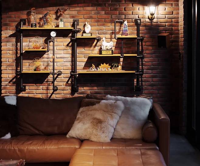 소파는 벽에서 조금 떨어뜨려 ㅁ자 형태의 동선을 만들었습니다. 이렇게 하면 공간이 더 넓어 보이고 사람들이 자유롭게 움직일 수 있습니다. 벽면에는 철제 파이프와 원목 선반을 조합한 디스플레이 공간을 설치해 책이나 소품을 멋지게 진열할 수 있게 했습니다.
