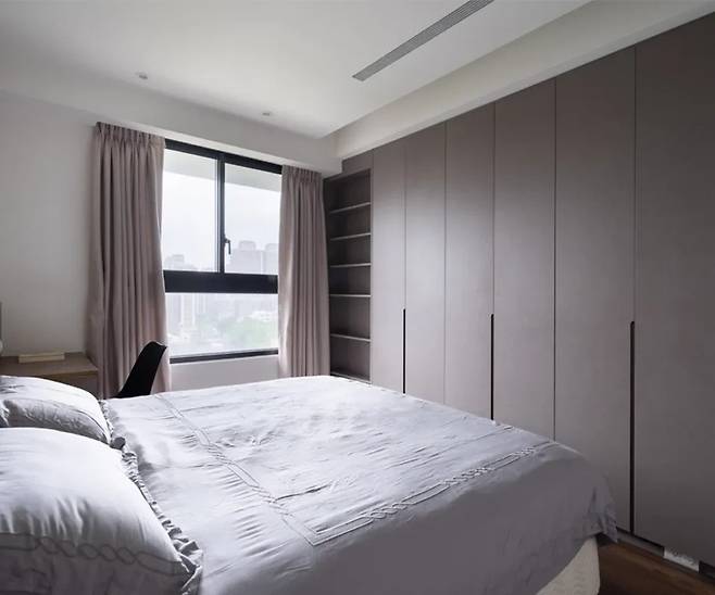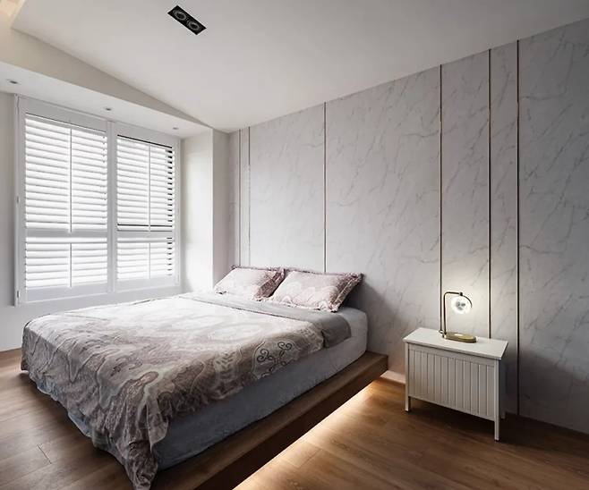 침대 뒤 벽면에는 특수 페인트로 그러데이션 효과를 주어 은은하고 고급스러운 분위기를 연출했습니다. 천연 목재 블라인드와 금속 장식 라인이 어우러져 모던하면서도 따뜻한 느낌을 줍니다. 천장은 경사진 형태로 시각적 답답함을 해소했습니다.