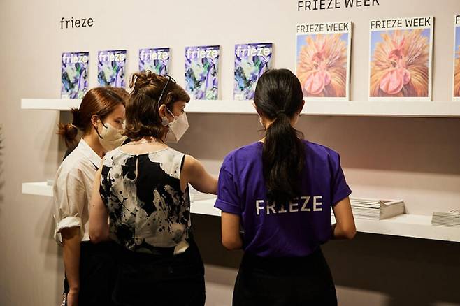 이런 아트 바젤에도 경쟁자가 있으니, 바로 오늘의 주인공, 프리즈야. 아트 바젤은 굉장히 상업적인 행사로 유명해. ‘미술장터인데 상업적인 게 당연한 거 아냐?’라고 생각하겠지만, 아트 페어가 촉발하는 공적인 기능이 있어. 부자 컬렉터만 입장하는 곳이 아니라 티켓값을 감당한다면 누구든 구경할 수 있는 게 아트페어이다 보니, 어느새 그 해의 아트 신을 파악하고, 될성부른 작가들을 살펴보는 기회가 된 거야. 그래서 시장에서 인기 있는 뻔한 작품만 나오는 페어에 대한 반감도 생겼어. 프리즈는 이런 흐름을 타고 21세기에 ‘짠’ 하고 나타난 아트페어야. 프리즈는 동명의 미술 잡지인 <프리즈>에 기반을 두고 있어.