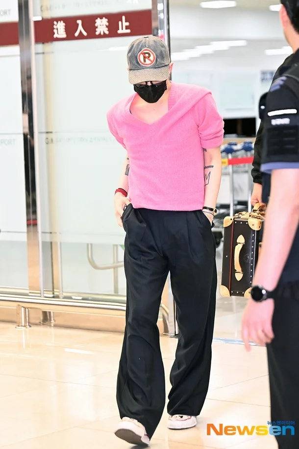 최근 지디는 핫핑크 니트와 블랙 와이드 팬츠를 매치한 공항 패션을 선보였습니다. 과감한 컬러와 넉넉한 핏의 조합은 지디만의 독보적인 스타일을 완성했는데요. 니트 소재에도 불구하고 그의 직각 어깨는 돋보였으며, 공항은 순식간에 런웨이로 변신했습니다.