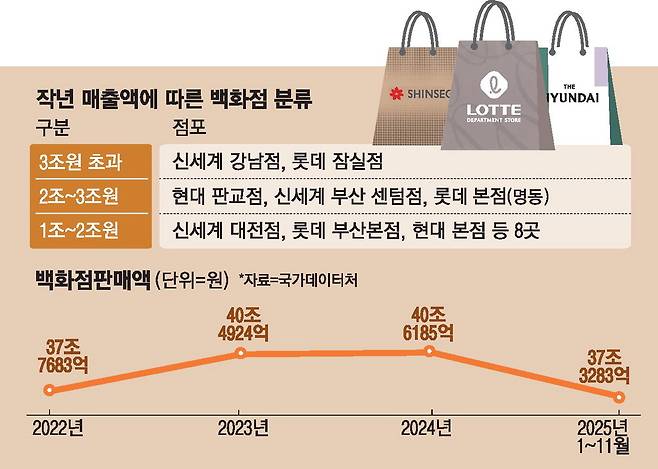 매출 3조원 이상에는 작년과 같이 신세계 강남점, 롯데 잠실점 등이 위치했다. 작년에 문을 닫은 곳은 2곳이 나왔다. 그랜드백화점 일산점, 현대백화점 디큐브시티점이 간판을 내린 데 이어 롯데백화점 분당점도 올해 3월 폐점을 앞두고 있다. 이에 비해 작년에 롯데·신세계·현대백화점이 새롭게 문을 연 점포는 없다.