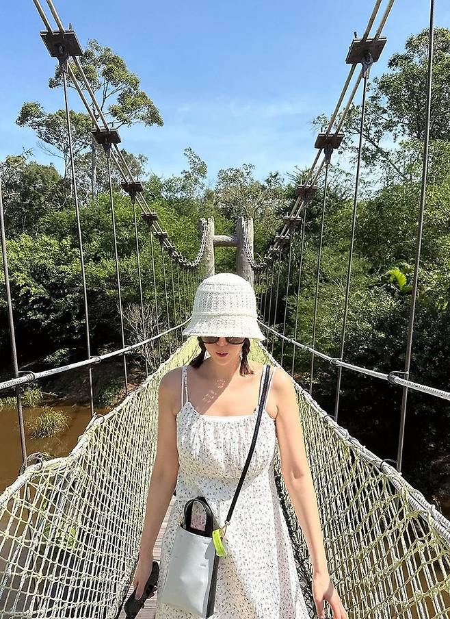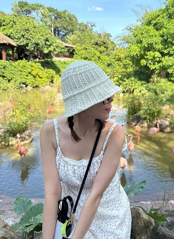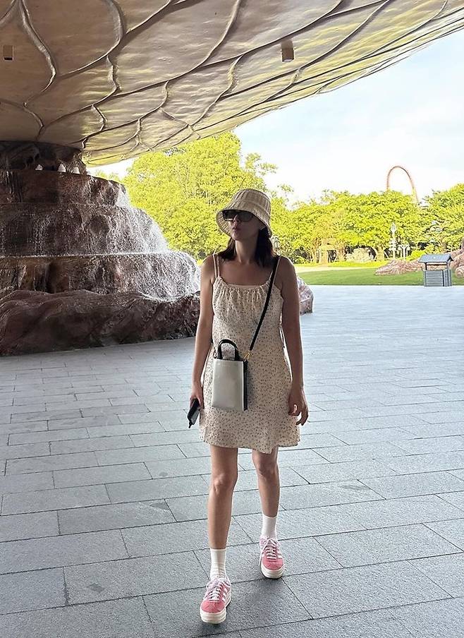 가수 신지가 버킷햇과 꽃무늬 원피스로 43세 나이 잊은 예쁜 요정 핏을 드러냈다.