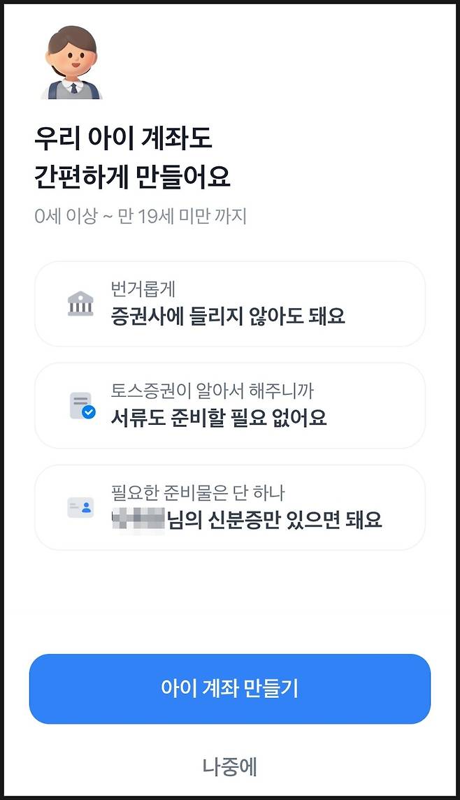 저도 같은 고민을 하다가 1년 전, 딸을 위해 토스증권에서 주식 계좌를 만들어주었습니다.