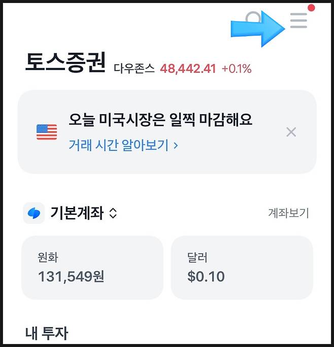 토스 앱 접속 후 우측 상단 세 줄 표시클릭해주세요.