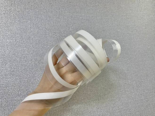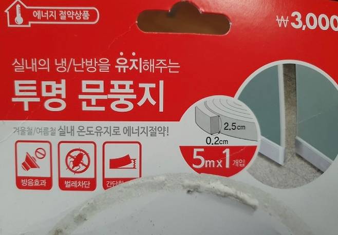 일단 실리콘 소재를 먼저 써봤는데요. 뭔가 생각했던 문풍지의 느낌은 아니라서 어떻게 사용해야 하나 당황스럽더라고요. 이렇게 투명하고 얇은 띠 모양이에요. 길이는 5m라고 하는데, 생각보다 금방 쓰더라고요.