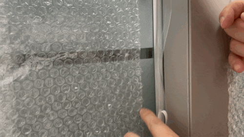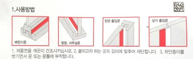 하얀 불투명 막을 떼면 접착 면이 나오는데요. 창틈에 실리콘이 있는 위치에 붙여줘야 해요.