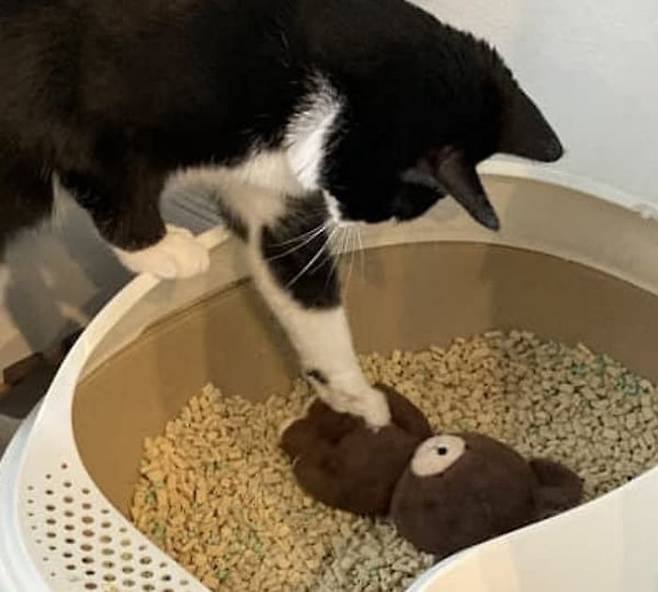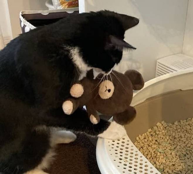 공개된 사진 속에는 고양이가 곰인형을 입에 앙 물고서는 자기 화장실 앞으로 다가간 모습이 담겨 있었죠.