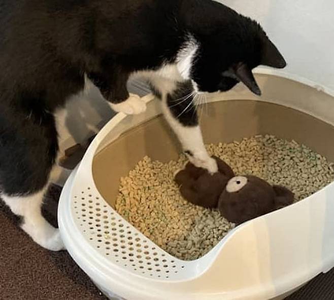 사연은 이렇습니다. 고양이를 키우는 집사는 SNS를 통해 곰인형에게 화장실 사용하는 방법을 손수 알려주고 있는 고양이 모습이 담긴 사진이 올라온 것.