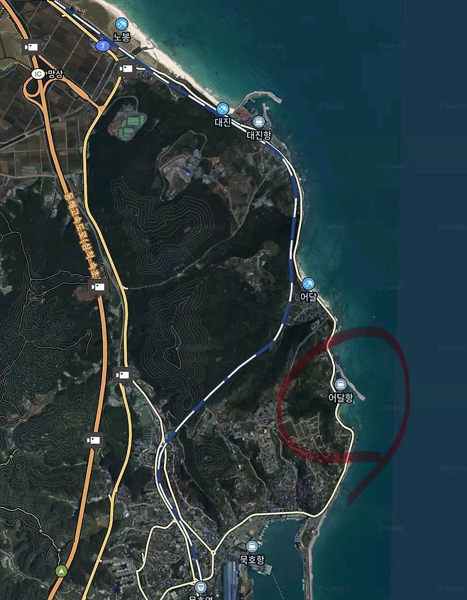 녹색파란색 부근의 갯바위 지대는 돌우럭 포인트입니다.