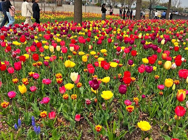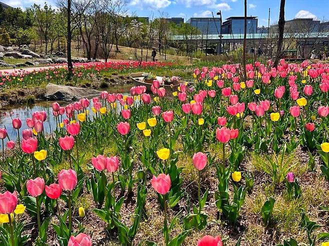호수원에서는 길게 펼쳐진 튤립길을 따라 800m가 넘는 산책로를 즐기며 꽃을 감상할 수 있다.