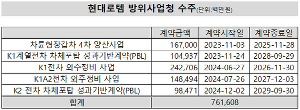 현대로템에 따르면 현재 5건의 양산 및 정비(PBL) 계약이 진행중이다. 사업 및 계약금액은 △차륜형장갑차 4차 양산 1670억원 △K1계열전차 차체포탑 성과기반계약(PBL) 1049억원 △K1전차 외주정비 사업 2427억원 △K1A2전차 외주정비 사업 1485억원 △K2전차 차체포탑 성과기반계약(PBL) 985억원 등 총 7616억원이다.
