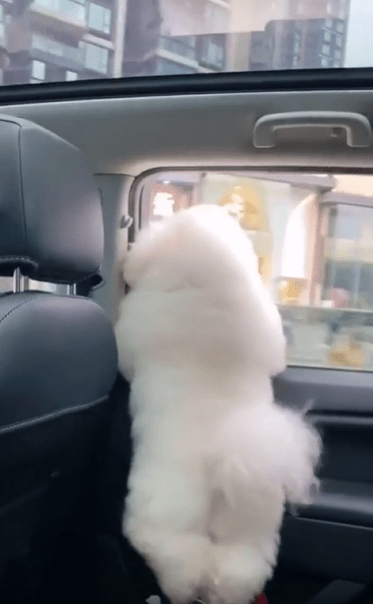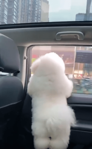 조수석 창문 쪽에 작은 강아지 한 마리가 두 발로 서 있습니다. 작고 복슬복슬한 앞발을 유리창에 가지런히 올린 채, 온몸을 창밖을 향해 쭉 내민 모습. 고개는 살짝 들리고, 두 눈은 또렷하게 창밖 어딘가를 바라보고 있습니다. 마치 “지금 우리가 도착한 거야? 아니지? 근데 곧이지?” 하고 묻는 것 같은 표정입니다.