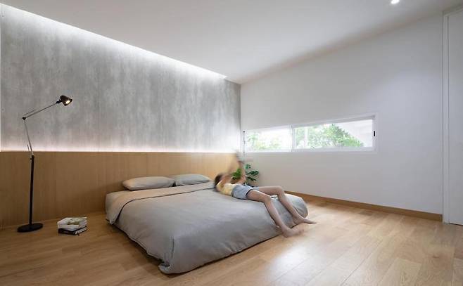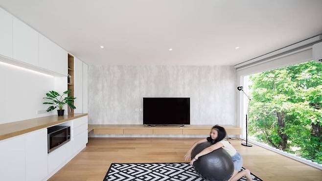 아이들은 이 공간에서 자유롭게 뛰놀고, 부모는 안락함 속에서 가족 모두의 동선을 고려한 배치를 즐깁니다. 하얀색 외벽은 햇살을 더욱 부드럽게 반사시키며 공간 전체에 포근한 무드를 만들어 줍니다.