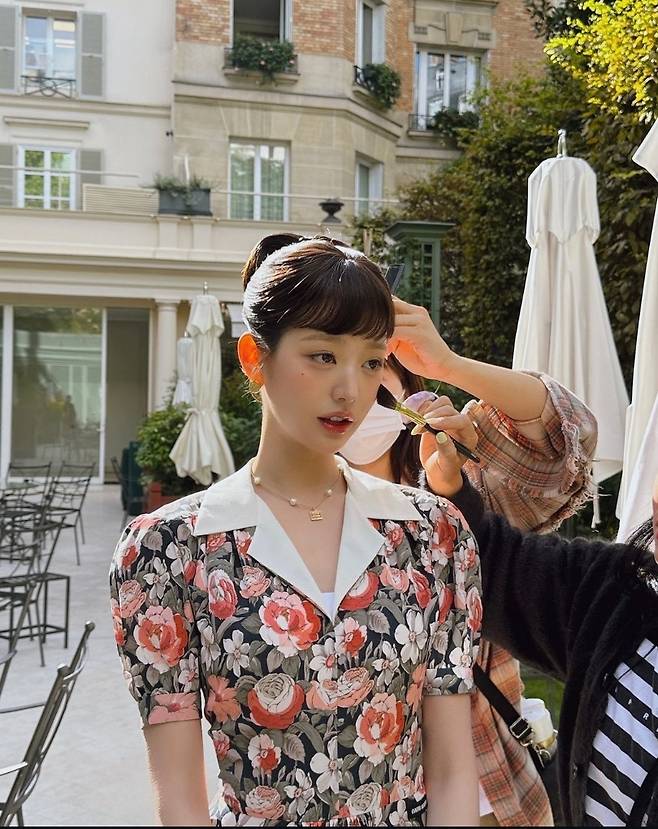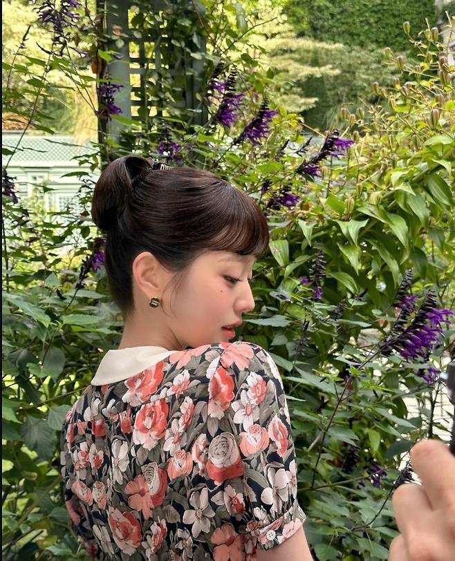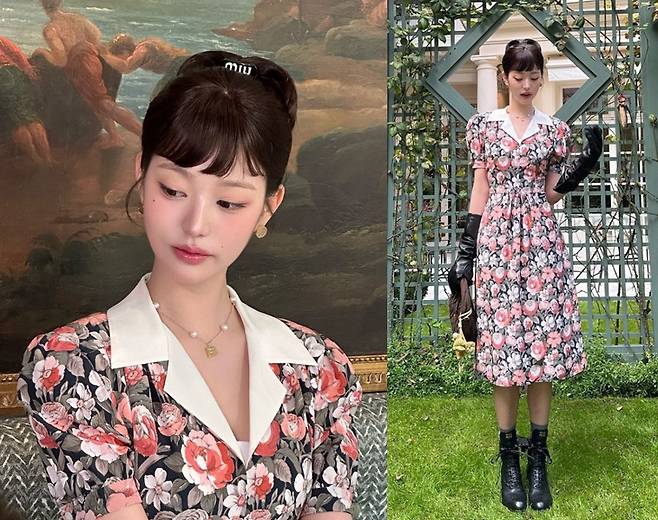 장원영은 화사한 플로럴 패턴의 원피스를 착용해 여성스러움과 고전적인 매력을 극대화했습니다.