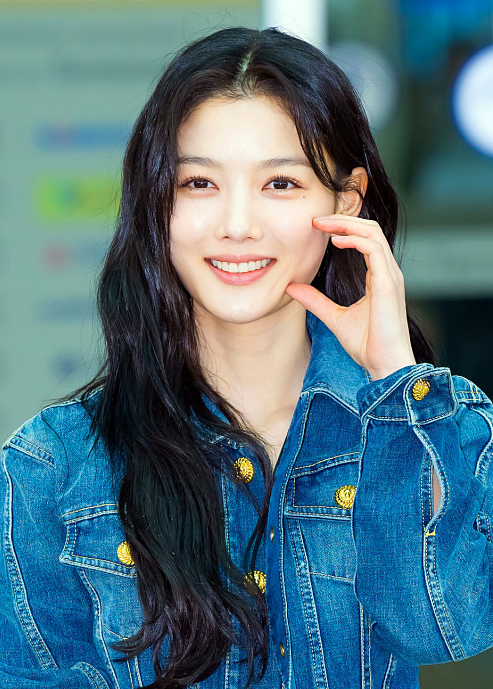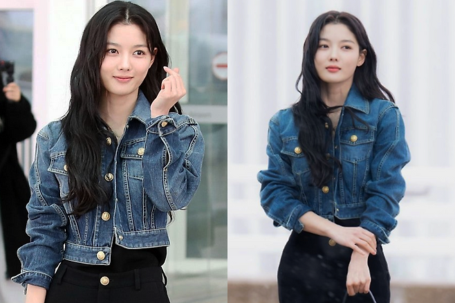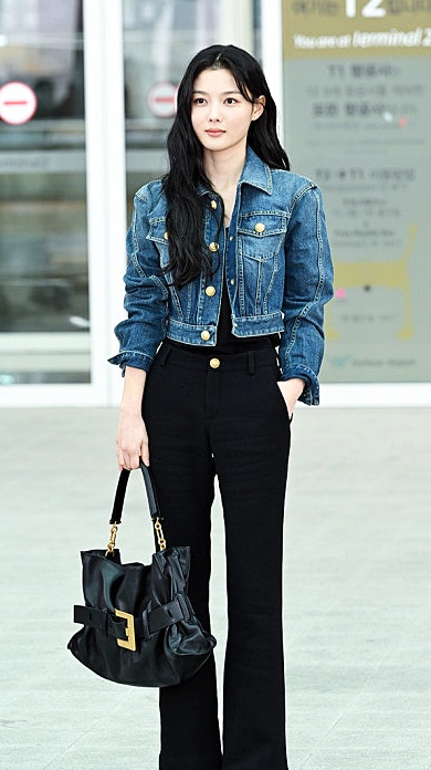 이날 김유정은 크롭 기장의 데님 재킷과 블랙 이너 티셔츠, 와이드 핏 슬랙스를 매치해 감각적인 공항패션을 완성했다.