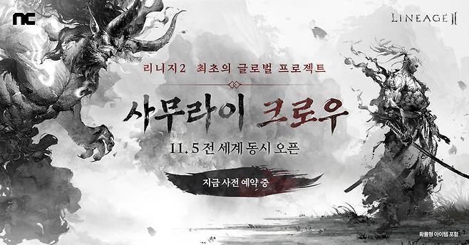'사무라이 크로우' 사전예약을 시작한다. 참여자는 크로우 귀걸이, 봉인된 여우 목걸이, 크로우 지원 상자 등을 받는다. 기존 리니지 2 이용자에게도 11월 5일 파괴된 장비를 복구할 수 있는 블랙 쿠폰, 캐릭터 클래스를 변경할 수 있는 클래스 체인지 등 혜택을 제공한다.