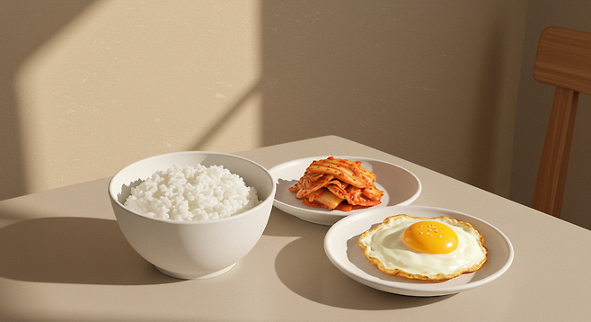 - 아침은 간단한 밥, 국, 김치, 달걀 등 기본 식재료로 준비합니다.