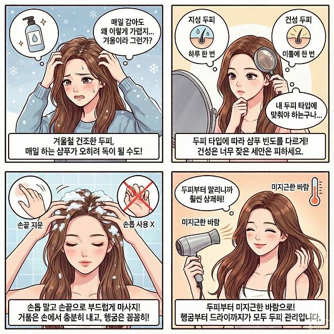 겨울철에는 두피가 쉽게 건조해지기 때문에, 샴푸 습관이 오히려 트러블을 키우는 원인이 될 수 있다. 하루라도 머리를 감지 않으면 찝찝하다는 이유로, 매일 샴푸를 고집하는 사람이 많다. 하지만, 두피 상태를 고려하지 않은 횟수와 세정 방식은 오히려 두피를 자극할 수 있다.