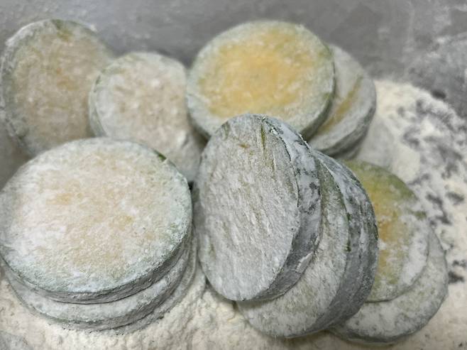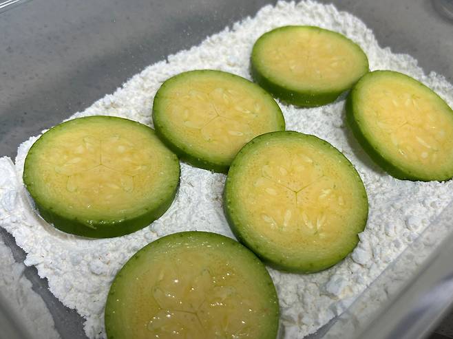호박에 가루가 곱게 잘 입혔죠? 가루가 너무 두껍게 입힌 것은 가볍게 털어냅니다. 가루는 얇게 묻히는 것이 좋아요.
