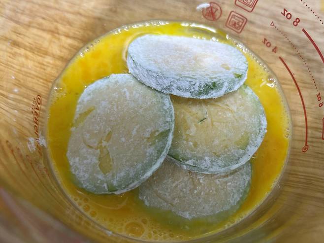 계란물에 이제 호박을 넣어 계란 옷을 입힙니다. 전체적으로 계란물이 잘 묻도록 해주세요.