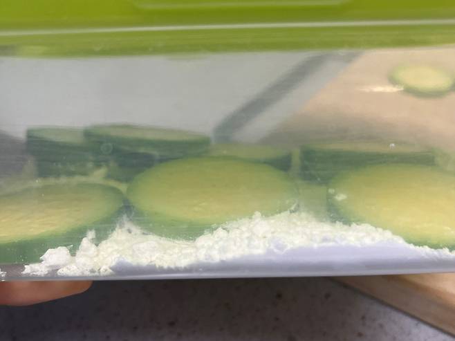 밀폐용기나 비닐봉지에 밀가루나 부침가루 등을 2스푼 넣으세요. 그리고 호박을 넣고 섞습니다.